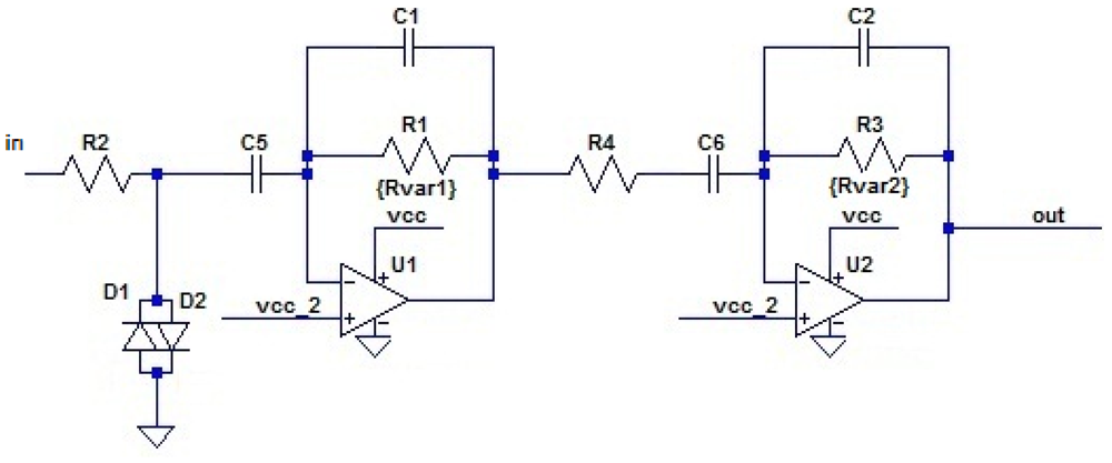 In summary, the received signal is filtered and amplified by a two-stage pass-band filter based on single-supply operational amplifiers. An attenuation slope of 40 dB/decade can be easily achieved in the stop-bands by using two stages. Moreover, overall gain can be obtained by multiplying each individual stage gain. As operational amplifier maximum gain is inversely proportional to the goal bandwidth, gain equalization through different stages leads to an optimal ratio between the filter bandwidth and the maximum achievable gain, which in this case is 40 dB (×100) per stage or 80 dB (×100,000) overall gain.