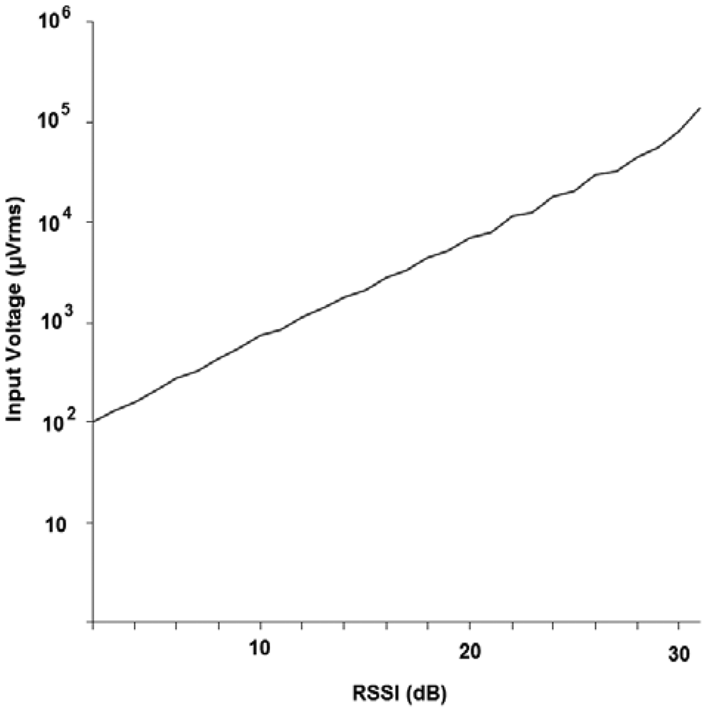 Figure 9 shows the relationship between RSSI registered values and signal μVrms. Signal strength is measurable above 100 μVrms, which corresponds to the wake-up module sensitivity. This level can be improved to 80 μVrms, thereby enabling an internal 3 dB additional amplifier.