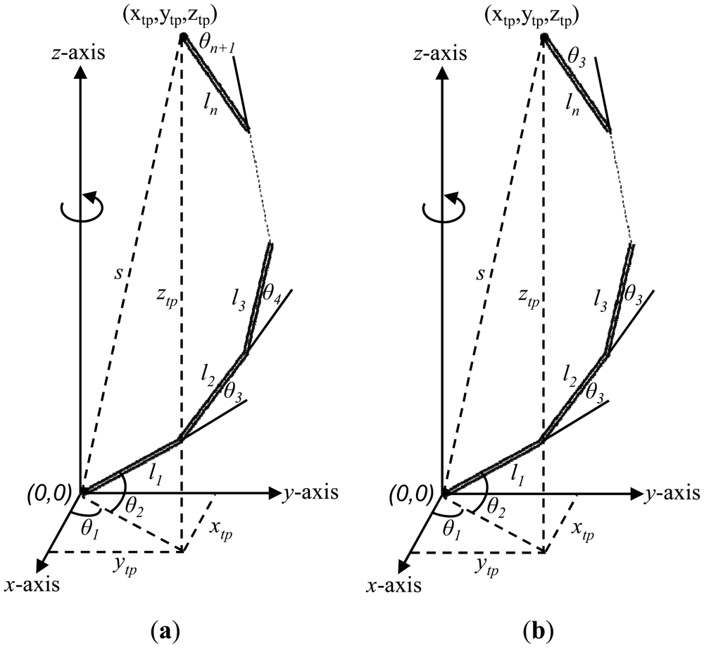 To control the motion of the end-effector of the manipulator shown of Figure 1(a), all the motors of the manipulator should be controlled. For example, to control a five links planar redundant manipulator with the ability to rotate the entire manipulator around its vertical axis, the six motors (five motors for each joint angle and one motor to rotate the entire manipulator around its vertical axis) of the manipulator should be controlled. Using the method of our papers [12,13], the configuration of the manipulator will have three angles to be controlled instead of n angles. Figure 1(b) shows the configuration of the manipulator when there are just three angles that need to be controlled.