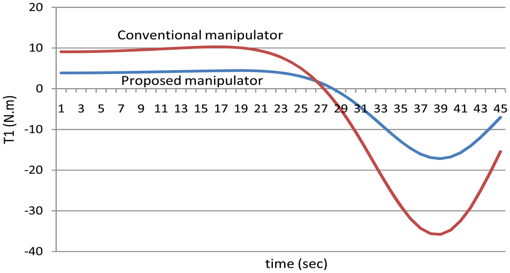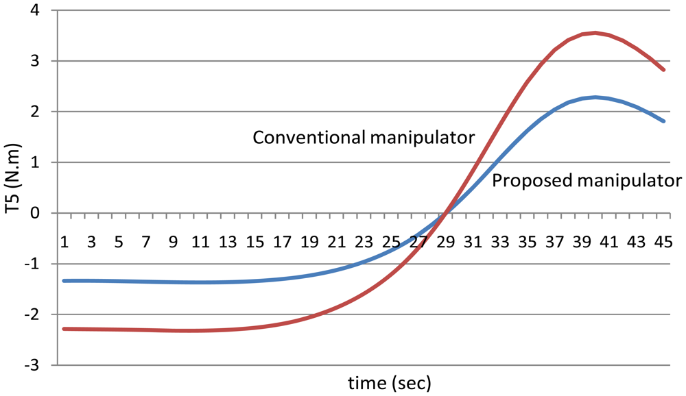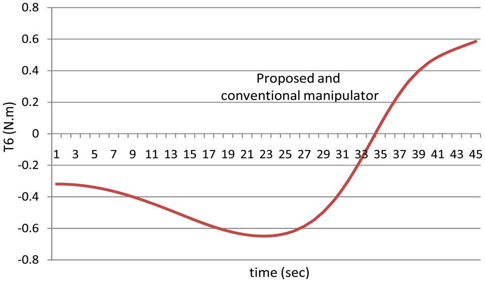 First of all, it is noted that the torque of the sixth joint has the same value using both the manipulators because the sixth link has the same mass for both the manipulators, in other words the mass of the sixth link is equal to the mass of the link itself only because it does not hold any motor.