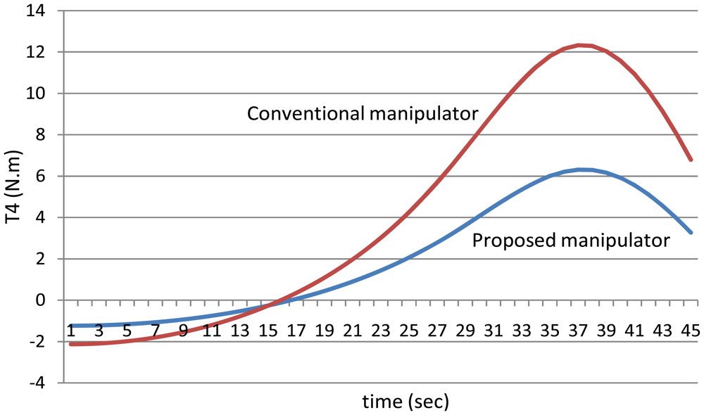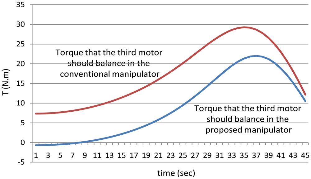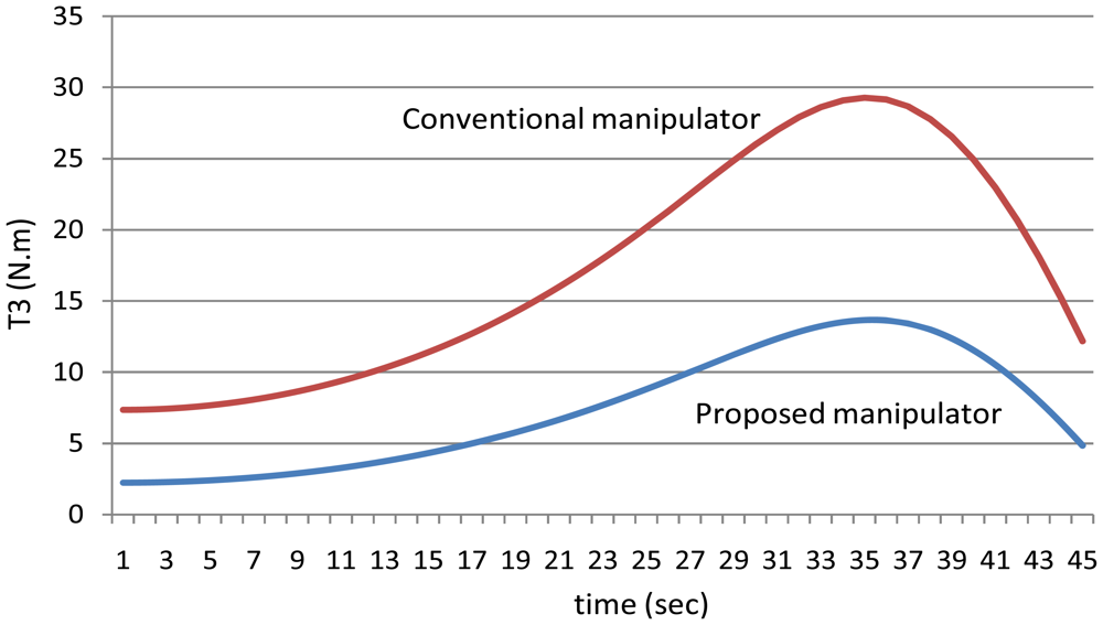 As mentioned in the first example that for the proposed manipulator, the third motor should balance the torque of all the third, fourth, fifth and the sixth joint, i.e., the torque of the third motor should equal (T3 + T4 + T5 + T6) for the proposed manipulator, Figure 26 shows that even though that this motor (third motor) should balance the torques of four links, this motor could be smaller in size (less power) in the proposed manipulator than the third motor in the conventional three dimensional planar manipulator.