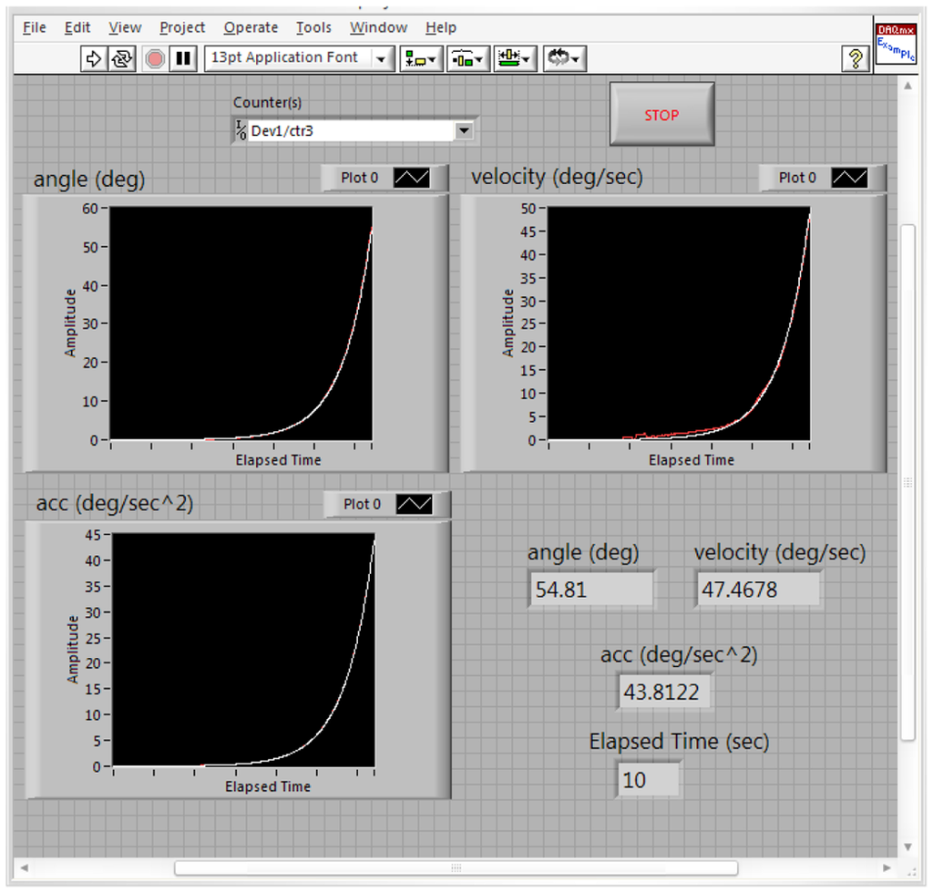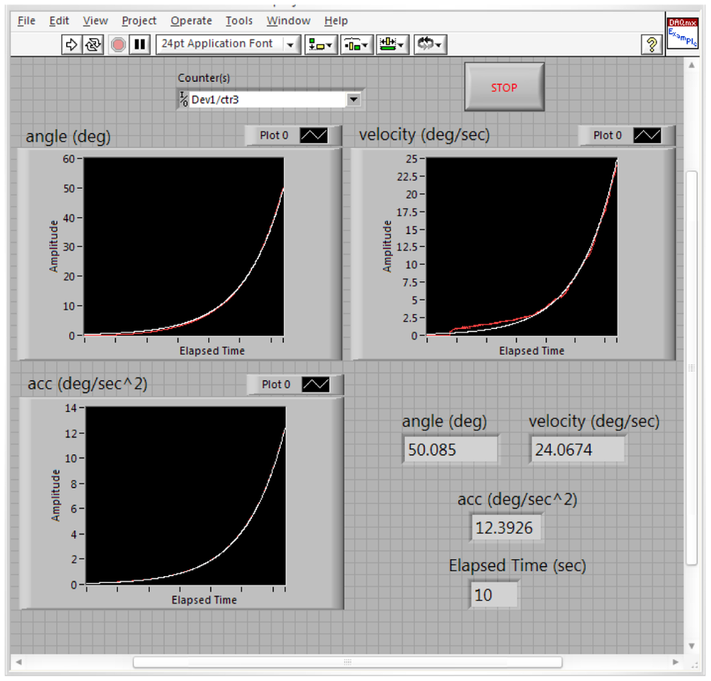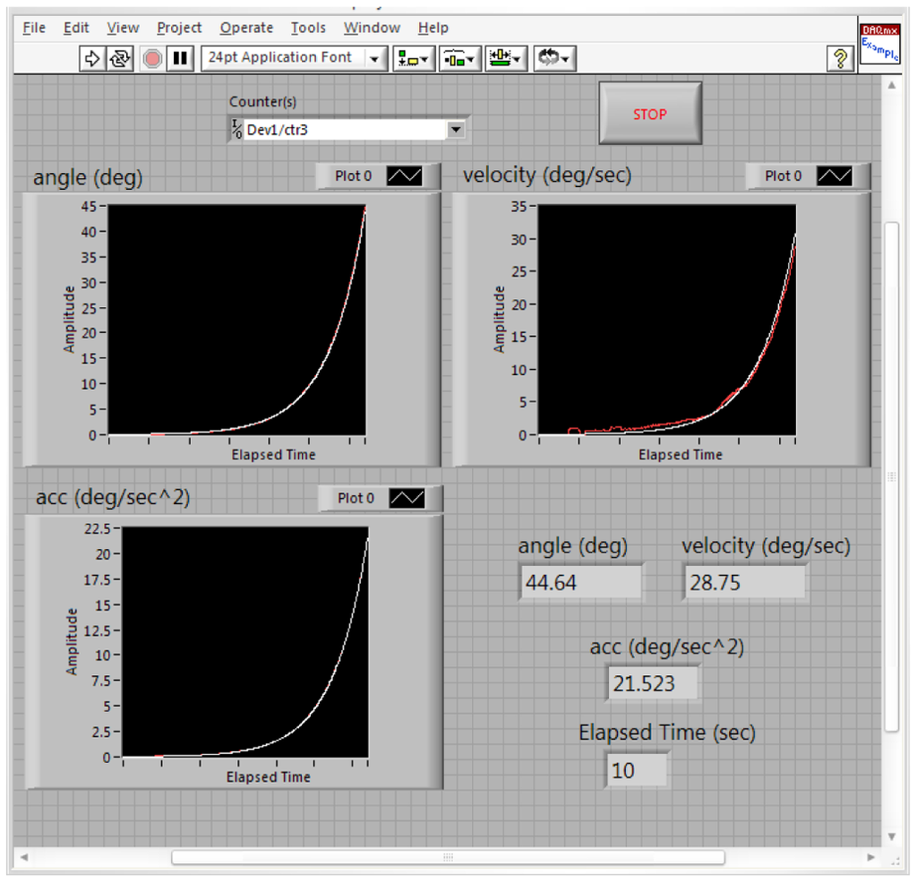 Figure 17 shows the estimated (white) and measured (red) angle, angular velocity and angular acceleration of the first joint angle defined above. Figure 18 shows the estimated (white) and measured (red) angle, angular velocity and angular acceleration of the second joint angle.