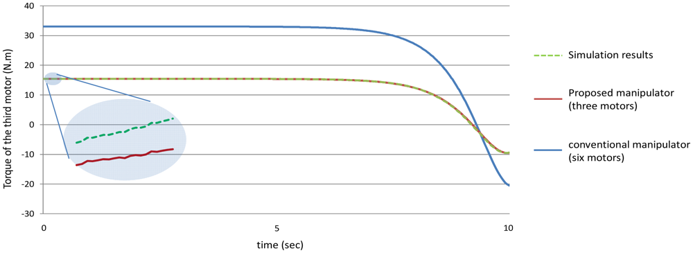 Secondly, as mentioned earlier for the proposed manipulator, the third motor should balance the torque of all the third, fourth, fifth and the sixth joint. In other words, the torque of the third motor should equal to (T3 + T4 + T5 + T6) for the proposed manipulator. Figure 16 shows the power that the third motor should balance for both the manipulators. It is noted from this example that using the proposed manipulator not only decreases the number of motors used in the manipulator, but also decreases the torques of the motors used to control it.
