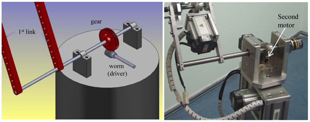 Elaborating further, the second motor is connected to the first link using a worm gear to control the angle θ2. Figure 3 shows the position of the second motor.
