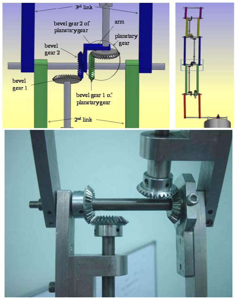 To ensure that all the links move at the same joint angle, the ratio between the bevel gears of each planetary gear should be equal to one. This means the bevel gears of each planetary gear should have the same diameter and number of teeth. If this arm is fixed, we get: