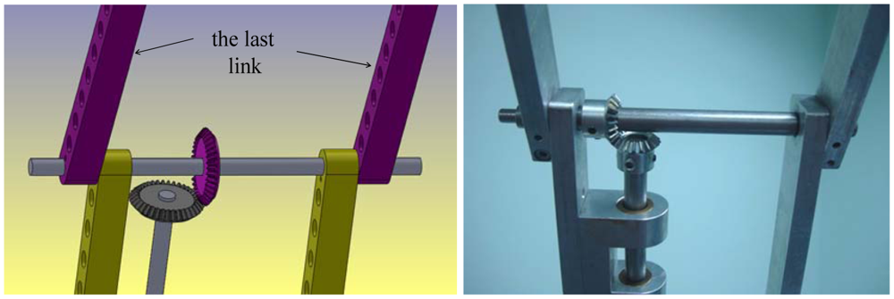 The mechanism of the third link is shown in Figure 5. The same mechanism of the second link is used; the only one difference is that instead of using s worm as a driver and s wheel gear as a driven, two bevel gears are used. The same mechanism of the third link can be used with the next links. The last link has the mechanism shown in the Figure 6. For further details of the mechanical design of the manipulator, our reference [14] can be checked.