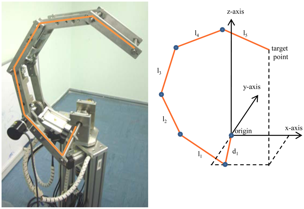 To calculate the transformation matrix of the manipulator, the draft of the manipulator shown in Figure 8, is used. The corresponding link parameters of the manipulator are shown in Table 1. Where l1, l2, …, l5 are the length of the links, while d1 is the offset between the origin and the end-effector.