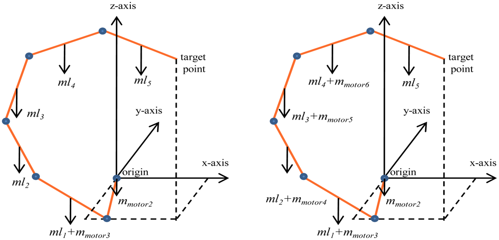 In this section, the torque of each joint is calculated. To show the effectiveness of the proposed manipulator, the joint torques are calculated using the proposed manipulator (using three motors only) and the conventional manipulators (a motor for each joint).