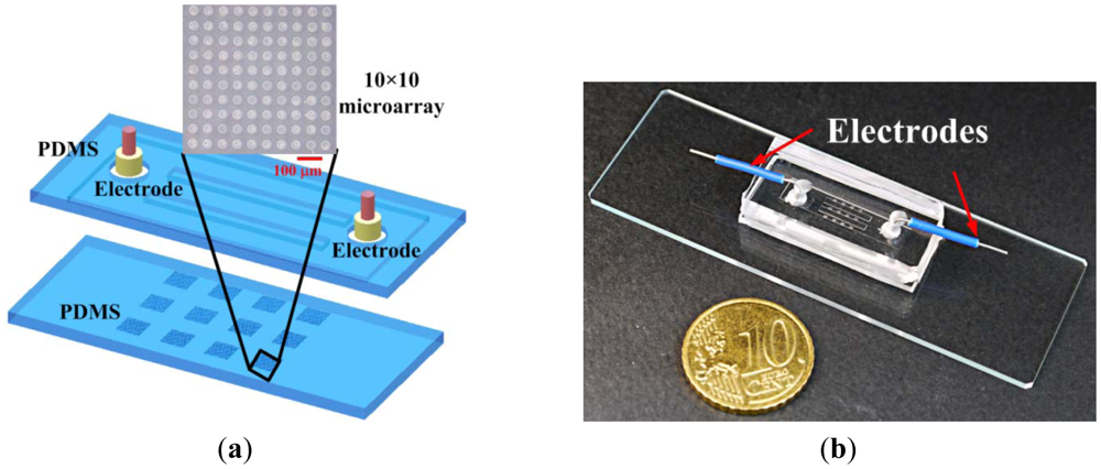 A biocompatible material, poly(dimethylsiloxane) (PDMS), was adopted for single-cell-based arrays in the microfluidic chip, as illustrated in Figure 1(a). The main channel, formed on the top PDMS layer, is 4.4 mm wide, 100 μm in height and 21 mm long. This main channel is divided into three microchannels, each 800 μm wide and 8 mm long, at the center region. Each microchannel contains four 10 × 10 microwells with 30 μm in diameter and 20 μm deep, on the bottom PDMS layer. The mold masters were fabricated by spinning SU-8 (SU-8 50, MicroChem Corp., Newton, MA, USA) on a silicon wafer to define the microwells and microchannel, respectively. The mold master of the microfluidic channels (around 100 μm in height) was fabricated by spinning SU-8 at 500 rpm for 20 s and then at 1,000 rpm for 35 s on the silicon wafer. The resist was soft baked on a hotplate at 65 °C for 10 min and then at 95 °C for 30 min. The resist was then allowed to cool to room temperature. The SU-8 was exposed to ultraviolet (UV) radiation at a dose of 200 mJ/cm2. The post-exposure baking was done at 65 °C for 3 min and then at 95 °C for 10 min. The exposed samples were developed with SU-8 developer for 5 min. The mold master of the microwells (around 20 μm in height) was fabricated by spinning SU-8 at 500 rpm for 20 s and then at 4,500 rpm for 35 s on a silicon wafer. The resist was developed with SU-8 developer for about 2 min after baking and exposure to UV radiation under the conditions mentioned above. PDMS prepolymer mixture (Sylgard-184 Silicone Elastomer Kit, Dow Corning, Midland, MI, USA) was poured and cured on the mold masters to replicate the patterned structures. After peeling off the PDMS replica with the microchannel, the inlet and outlet ports were made by a puncher. The two PDMS replicas were bonded after treatment with oxygen plasma in an O2 plasma cleaner (model PDC-32G, Harrick Plasma Corp., Ithaca, NY, USA). Electrodes were inserted into the inlet and outlet for applying the voltages. The distance between two electrodes is 15 mm. A photograph of the completed microfluidic chip is shown in Figure 1(b).
