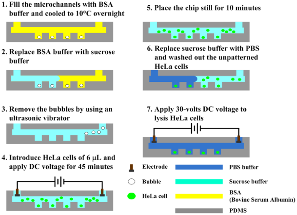 The experimental procedures are illustrated in Figure 2. First of all, the microfluidic channel was washed and blocked overnight with bovine serum albumin (BSA) buffer (10 mg/mL) to avoid nonspecific absorption of cells. The sucrose solution was injected manually to replace the blocking buffer prior to experiments. The trapped bubbles within the microwells were removed using an ultrasonic vibrator. The cell sample of 6 μL, which has a concentration of 107 cells/mL was dropped, and then a direct current (DC) voltage of 5, 10 and 15 V was applied for 45 min to electroosmotically drive the cells into the microwells. The sucrose solution was used herein as a working fluid for electroosmosis to avoid the occurrences of joule heating and bubble formation due to the medium with a high conductivity, for example the phosphate saline buffer (PBS) [27]. The microfluidic channel was washed with PBS buffer after that the chip was placed still for 10 min. Finally, a DC voltage of 30 V was applied to perform the electric lysis in the PBS buffer with a high conductivity, in which the required voltage for lysis could be reduced. The cellular deposition in microwells and the electric lysis were then observed and recorded by an inverted fluorescence microscope (model CKX41, Olympus, Tokyo, Japan) mounted on a CCD camera (DP71, Olympus, Tokyo, Japan) and controlled by a computer with Olympus DP controller image software. The fluorescent images were quantitatively analyzed using NIH ImageJ (National Institute of Health, Bethesda, MD, USA) to measure the intensity of fluorescence. The fluorescence intensity from each pixel can be analyzed with the ImageJ program.