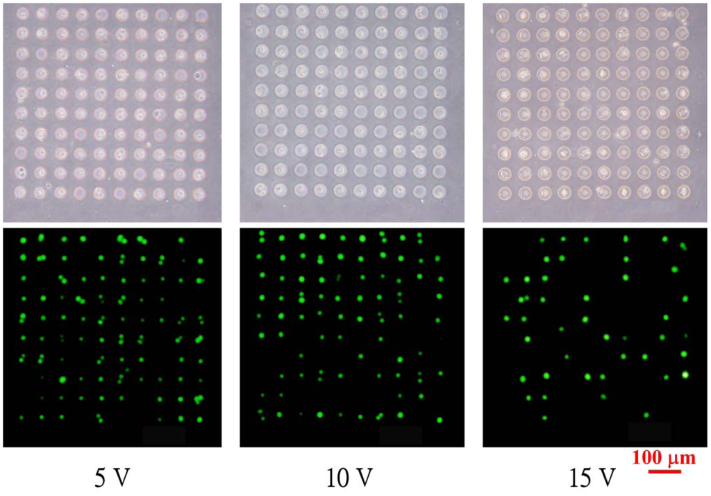 Micropatterned HeLa cells in the microfluidic chips with 30-μm-diameter microwells are shown in Figure 3; the applied voltages for electroosmotic flow are 5, 10 and 15 V, respectively. The occupancy of cells in the microwells when the voltages of 5 or 10 V are applied is higher than that for the applied voltage is 15 V. The fluorescent images of cells stained by calcein AM demonstrate the viability of the cells.