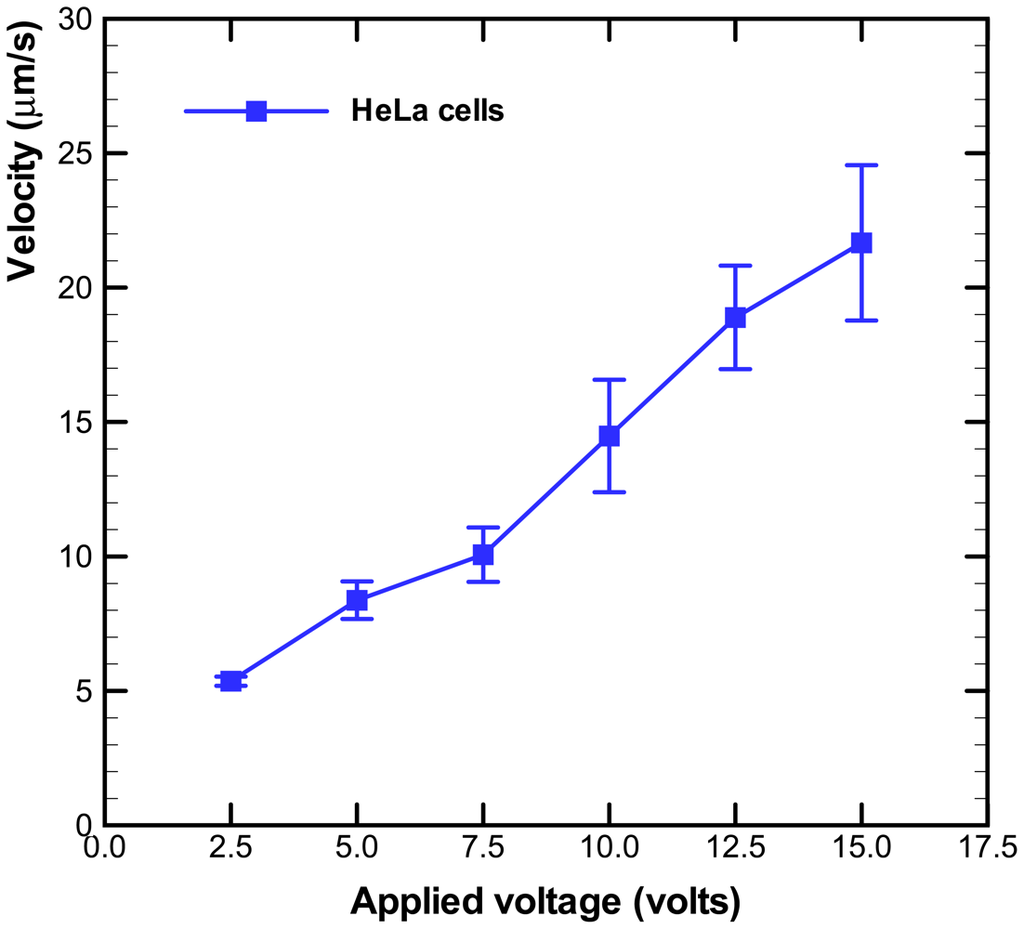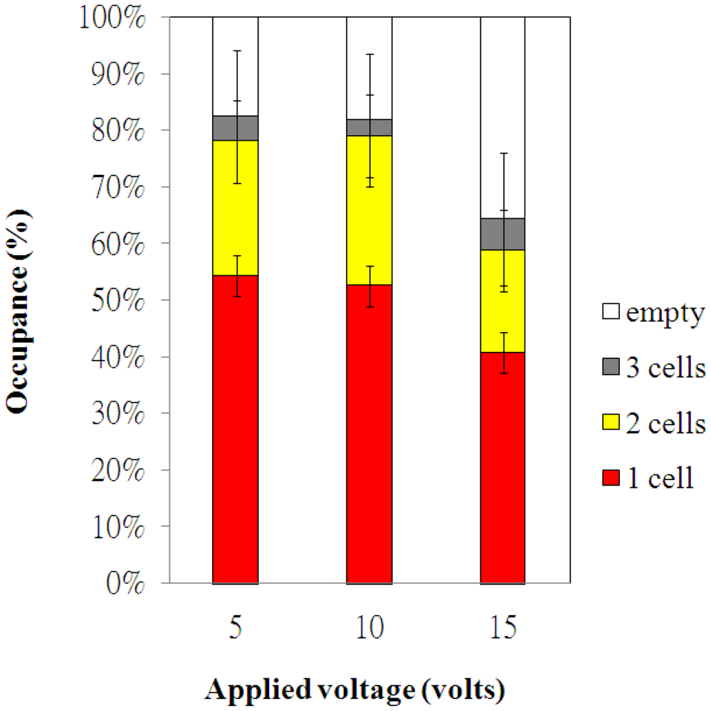 The electroosmotic-driven velocity of HeLa cells for different applied voltages are measured and plotted in Figure 4. The time of HeLa cells migrating a fixed distance (50 μm) was measured via the microscope. The measurements were repeated for more than three times for various applied voltages. The velocity of HeLa cells increased with the applied voltages, as shown in Figure 4. The experimental data of cell occupancy for HeLa cells in the microwells for various applied voltages are revealed in Figure 5. The experimental data is based on manual counts of cells in twelve arrays of 10 × 10 microwells using the inverted fluorescence microscope. Each experimental data point represents the average value, and the error bar shows the standard error of the mean. The occupancy of cells in the microwells decreases with increasing applied voltage due to the increasing velocity of HeLa cells. The cellular occupancy in the microwells when the applied voltage was 5 V (82.4%) was slightly higher than that in that (81.8%) at applied voltage of 10 V. When the applied voltage was increased to 15 V, the cellular occupancy in the microwells was dropped to 64.3%. More than 50% of the occupied microwells contain individual cells, as shown in Figure 5. Some of the 30-μm-diameter microwells contain two or three cells.