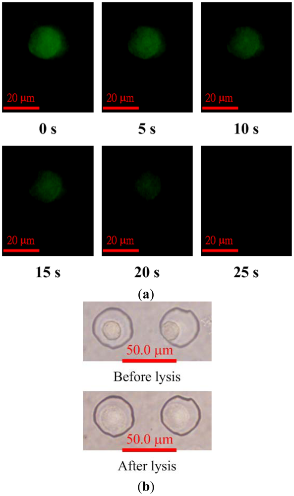 Images showing fluorescence intensity of calcein AM-loaded HeLa cells after applying the voltage of 30 V for electric lysis are shown in Figure 6(a). The averaged electric field, which is the applied voltage divided by the distance between the electrodes, was about 2 kV/m and assumed to be unaffected by the presence of cells. The fluorescence images indicate that the cell membranes were gradually lysed as the voltage for electric lysis was applied. Calcein leakage occurs when cell membranes are damaged; therefore, the fluorescence intensity within the cell decreases after the cell starts to lyse. The cell was fully lysed after 25 s, as shown in Figure 6(a). The bright-field images of the cell before and after lysis are shown in Figure 6(b). The cell membrane was damaged by the electric field and the cell swelled. However, the cells remained in the microwells after lysis.