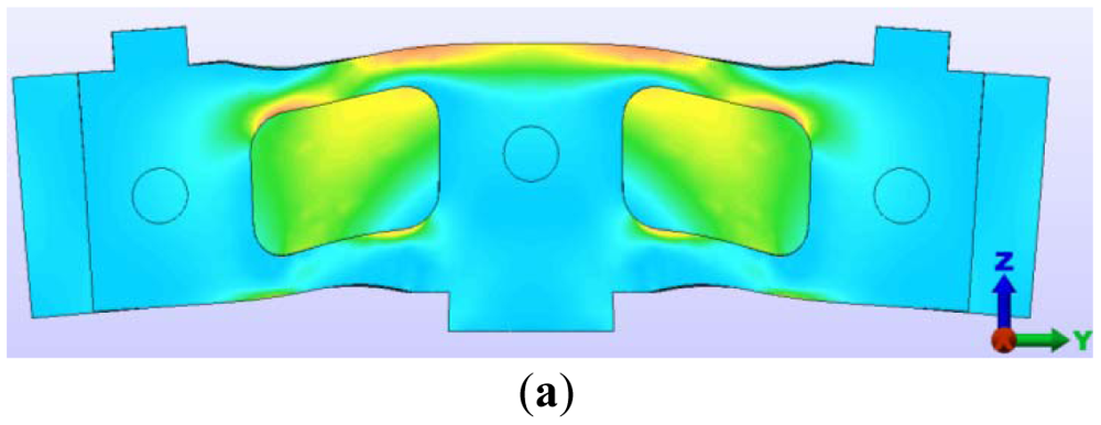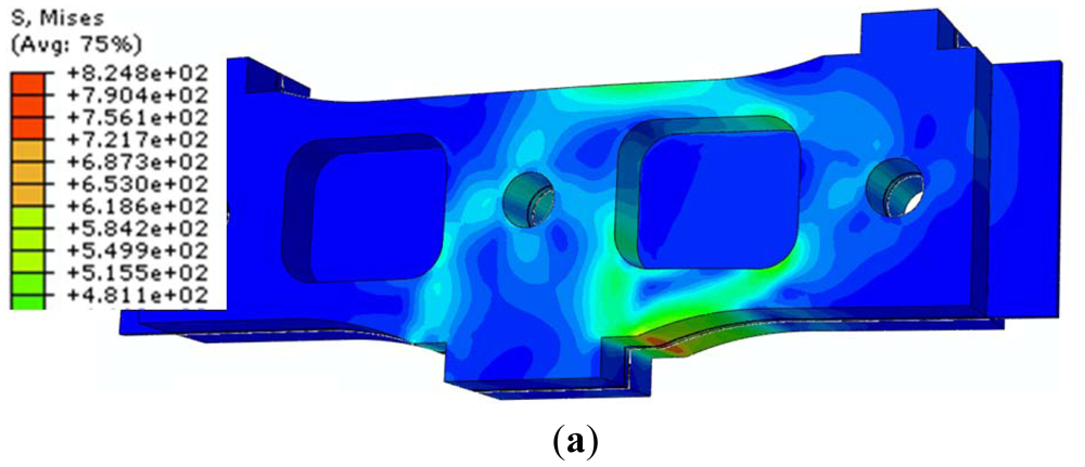 Using Equation (1) for the Sandvic 7C27M02 stainless steel (σu = 1,600 MPa), the fatigue strength for symmetric cycle is obtained as σ−1 = 667 MPa. Comparing this value with the absolute value of the maximum stress from Table 3, one may notice that for the new design, the absolute minimum value of normal stress σmin (658.179 MPa) is lower than the fatigue strength for a symmetric cycle: