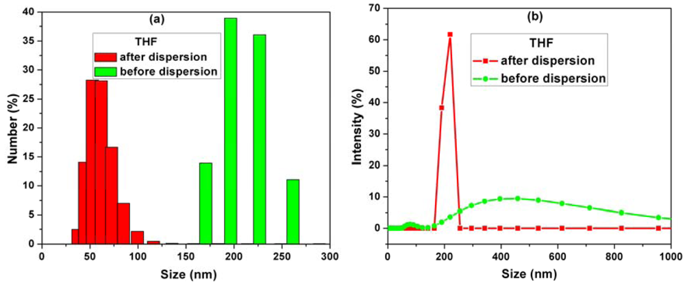 By comparison of the MWCNTs sizes before and after dispersion in THF, the information about the dispersion degree in THF is obtained. Before dispersion the mean particle sizes ranged between 150–300 nm. After dispersion, the mean particle sizes revealed more than 50% decrease in agglomeration of CNTs as a result of the ultrasonication process (Figure 1(a)).