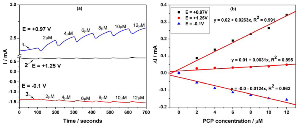 Figure 10(a) presents the pulsed amperograms recorded at each potential values for PCP detection. As can be seen, for each potential value the corresponding current depended linearly on PCP concentration (Figure 10(b)), but only the anodic ones have been taken into consideration. Reversing, the advanced oxidation and the reduction processes allow the in-situ regeneration of the electrode surface. Applying the MPA technique improved significantly the performance of the electrode for PCP detection.