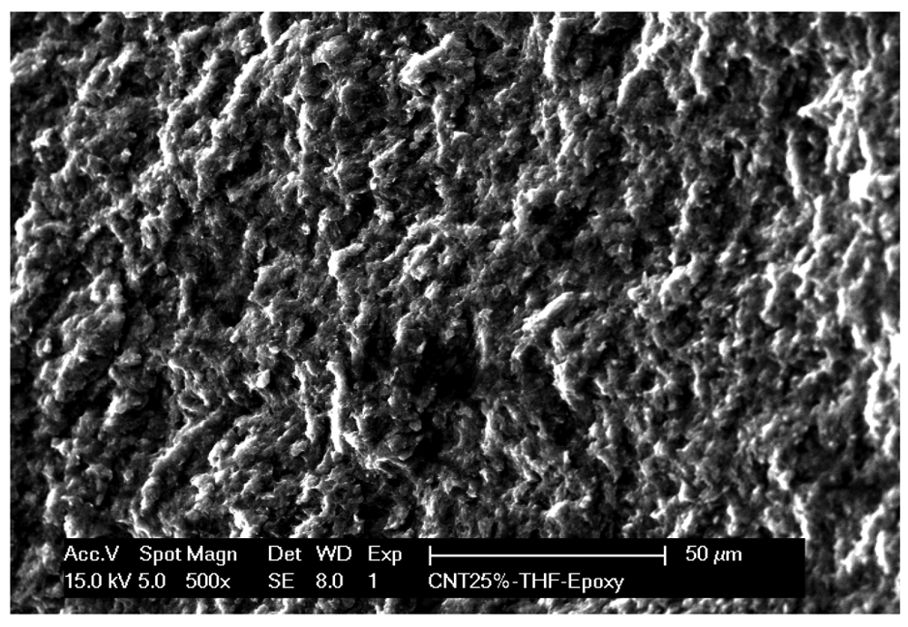 The dispersion and bonding of the nanotubes to the epoxy resin matrix is the most important issue in producing the CNT-epoxy composite materials [15]. SEM microscopy was used to gain insight into the surface characteristics of the MWCNT-EP composite. Figure 2 shows the SEM image of the MWCNT-EP composite electrode and it can be seen that MWCNTs are homogeneously dispersed and distributed within the polymer matrix.