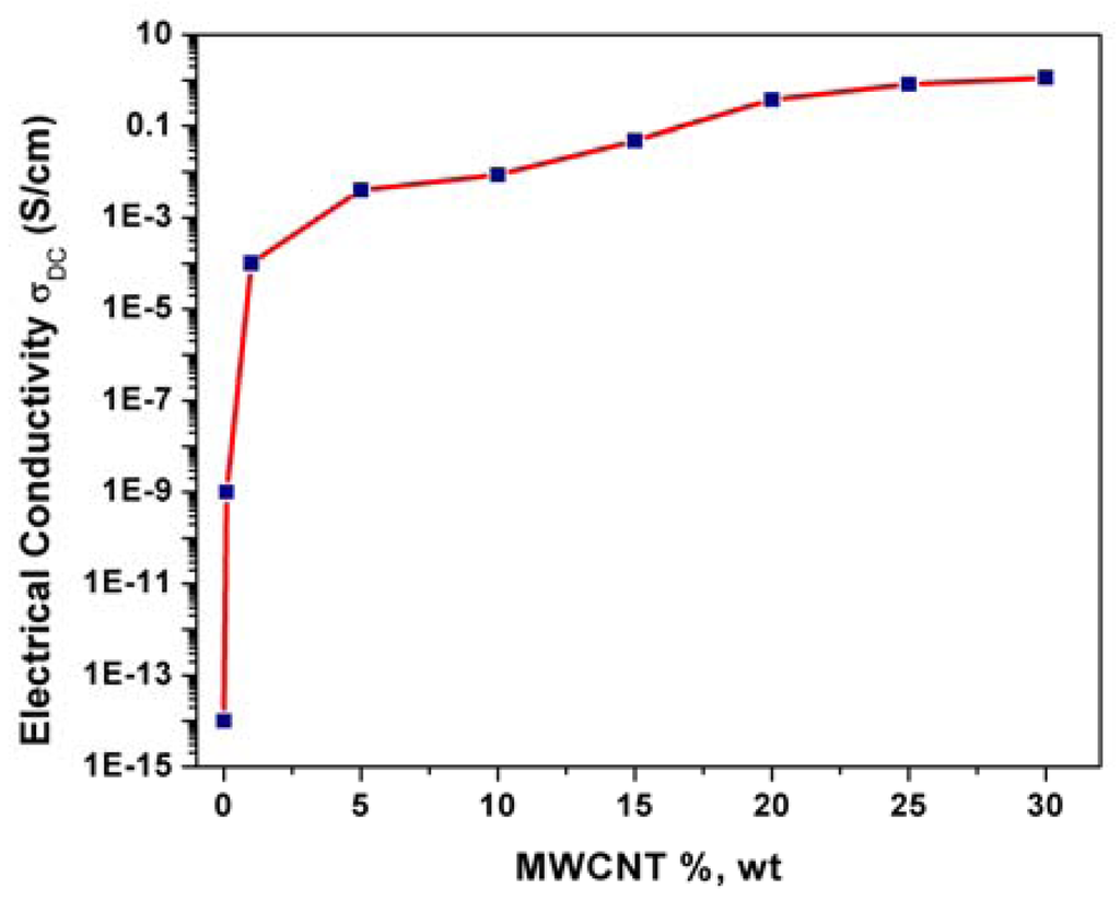 The electrical conductivity of a composite is strongly dependent on the filler loading and Figure 3 shows the evolution of the electrical conductivity with MWCNTs loading within the epoxy matrix. At low filler concentrations, the conductivity remains very close to the conductivity of the pure, electrically insulating polymer matrix since the fillers are dispersed individually or are present as small clusters in the matrix. The electrical conductivity increased with the MWCNTs loading increasing until a certain value, which represents the percolation threshold concentration. For this MWCNTs loading range, the independent CNT fillers tend to link together to form conductive networks, leading to a significant increase in the electrical conductivity of the composite (from 10−9 S/cm to 10−4 S/cm). Above this MWCNTs loading value, no significant increasing of the electrical conductivity occurred and a plateau is reached.