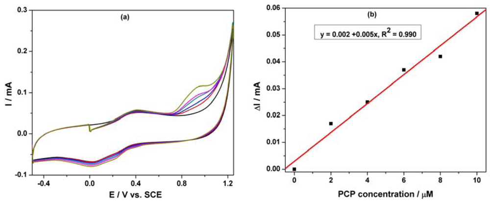 Based on our previous research regarding the electrochemical determination of pentachlorophenol (PCP) on a carbon nanofiber-expanded graphite-epoxy composite electrode [11], the electroanalytical peculiarities of this MWCNT-EP composite electrode towards PCP determination were studied. Cyclic voltammograms (CVs) recorded on the MWCNT-EP composite electrode in 0.1 M Na2SO4 supporting electrolyte and various concentrations of pentachlorophenol (PCP) are shown in Figure 4(a).