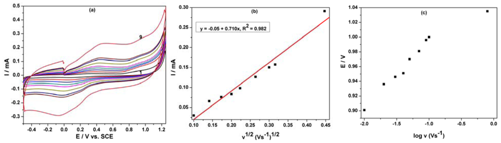 Cyclic voltammetry (CV) is one of the most versatile electrochemical techniques used in the study of electroactive behaviour and the characterization of sensors. In order to determine the electroactive surface area of the MWCNT-EP composite electrode the electrochemical behaviour of potassium ferrocyanide K3[Fe(CN)6] in 1 M KNO3 supporting electrolyte was studied using cyclic voltammetry recorded at different scan rates. According to the Randles–Sevcik Equation (1):