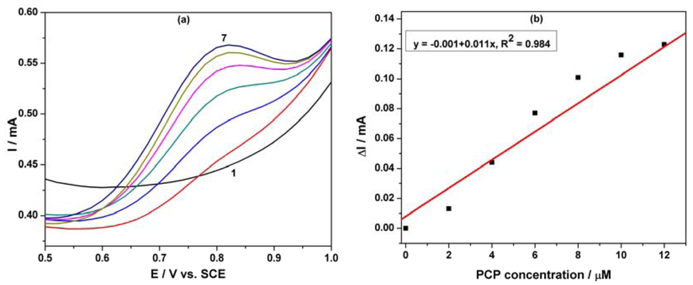 Figure 7(a) shows SWV responses recorded with the MWCNT-EP composite electrode for various concentrations of PCP under optimized conditions, i.e., frequency (f) of 10 Hz, modulation amplitude (MA) of 0.1 V, and step potential (SP) of 0.01 V. Figure 7(b) corresponds to the calibration curve of the useful current with PCP concentration, which shows the linear dependence for the concentration interval ranged between 2 and 12 μM PCP. Under the conditions of this applied technique application, the best sensitivity was achieved, which is comparable, however, with the sensitivity obtained by DPV. This aspect should be attributed to the diminution of the capacitive component and implicit the background current that affects the useful signal of the PCP detection by SWV.