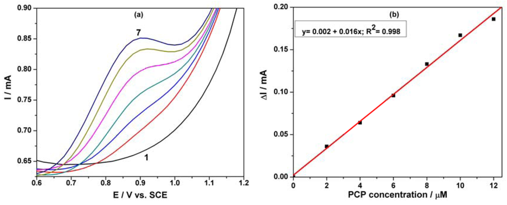 Differential-pulsed voltammetry (DPV) has been employed as a technique for the evaluation of the performance of the MWCNT-EP composite electrode for the determination of PCP. The effects of DPV scan parameters on the response of the MWCNT-EP composite electrode have been studied. Modulation amplitude (MA) and step potential (SP) parameters have been considered to optimize the determination method and the best results were achieved for MA of 0.2 V and SP of 0.02 V. Figure 6(a) shows the DPVs recorded for the PCP concentration ranged between 2 and 12 μM in the potential range of +0.5 to +1.0 V vs. SCE, and the oxidation potential is shifted to the negative direction in comparison with the CV results (+0.80 V vs. +0.97 V vs. SCE). The useful net current signals corresponding to the oxidation peak recorded at +0.80 V/SCE are linearly dependent on the PCP concentration (Figure 6(b)). The lower detection potential value and a better sensitivity were achieved by using DPV in comparison with CV (see Table 1).