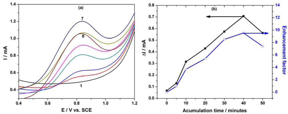 It is well-known that in a preconcentration/voltammetric detection scheme, the extent of preconcentration is a function of accumulation time, which determines the degree of adsorption on the electrode surface. The effect of accumulation time on the currents of the differential-pulsed anodic peaks recorded at +0.83 V/SCE corresponding to PCP oxidation was investigated. The enhancement factor was determined as ratio of the peak current recorded at different accumulation times to that recorded without a preconcentration scheme. The useful oxidation peak currents and the enhancement factors determined for 8 μM PCP using a preconcentration/voltammetric detection scheme at different accumulation times are shown in Figure 8(a).