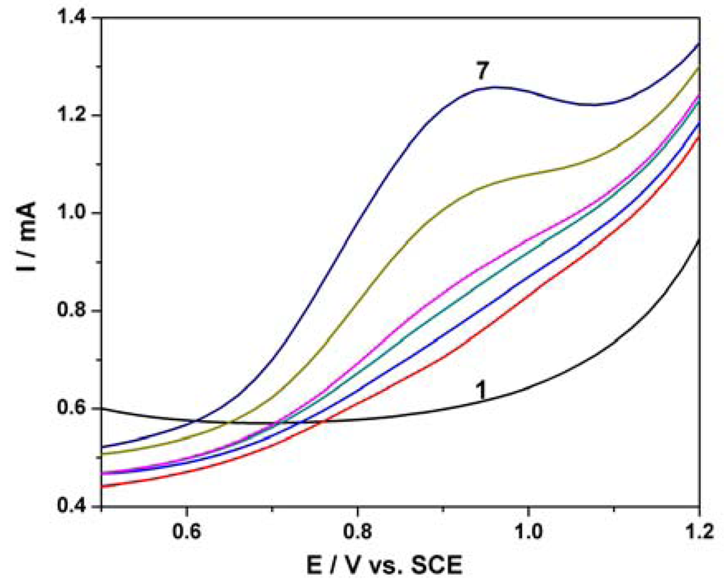 For practical working applications the optimum analytical procedure should involve the recording of the chronoamperogram, based on the existing well-established essential point of reference provided by the voltammograms. Thus, a series of chronoamperograms was recorded at the potential value of +0.97 V/SCE within a PCP concentration range between 2 and 10 μM (results are not shown here) and the sensitivity obtained was poor compared to CV, probably due to electrode fouling (see Table 1). An alternative to the amperometric detection to improve the electroanalytical parameters and proposed in this work, is the use of MPA with three potential pulses, whose values were established based on CV behaviour. The pulses were applied continuously using the following scheme: