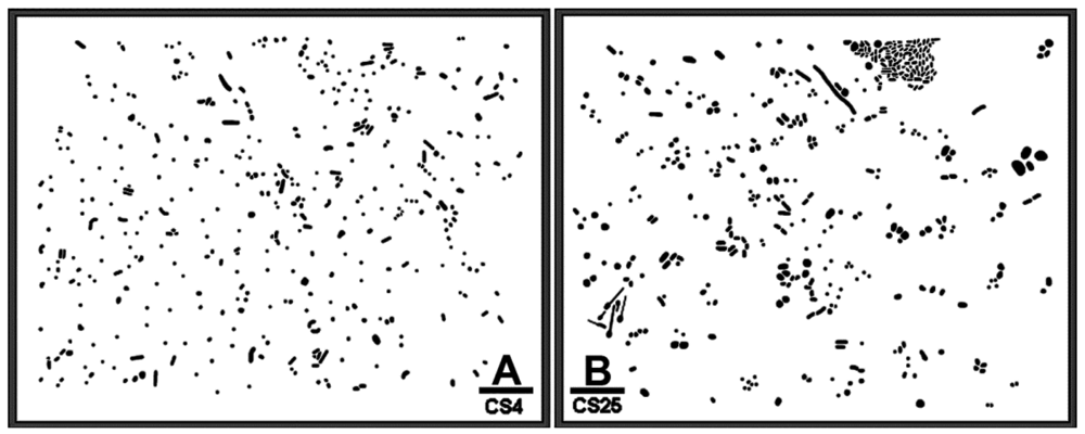 The frequency distribution of the cluster indices for these microbes is presented in Figure 4. This histogram plot indicates the shift to higher cluster indices for the bacteria in the CS25 biofilm landscape, indicative of their higher intensity of aggregated colonization behavior in situ.
