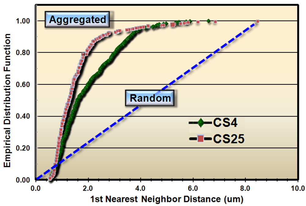 These results justified subsequent analyses to test whether the spatial patterns of microbial distribution deviated from complete spatial randomness, and if so, the intensity of their clustered aggregation. Several methods of spatial statistics were performed on the CMEIAS data to test this hypothesis. The first evaluation, called the Empirical Distribution Function, is a plot of the cumulative ranking of the 1st nearest neighbor distances measured between individual cells in the sample compared to the distribution that would result if the pattern were completely random. In this latter case, the data points would distribute along the diagonal, dashed blue staircase. The resultant plot of the empirical distribution function indicated that both biofilm samples had aggregated patterns of distribution, and that this colonization behavior was more intense in biofilm CS25 (Figure 2).