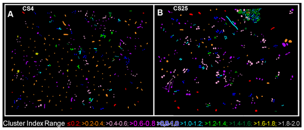 The CMEIAS 1-dimensional classifier was used to sort individual cells in the two biofilm images into bins based on division of a scale defined by a single measurement feature [5]. Figure 3(A,B) shows the classifier output of rendered images that provide a quick, visual appraisal of the binned clustered index assigned to each individual bacterium in situ in the CS4 and CS25 biofilms. This pseudocolored classification scheme indicates a preponderance of well-dispersed cells and a few small clusters (cluster indices < 0.4) in the CS4 biofilm (Figure 3(A)), and a larger proportion of cells grouped into aggregates (cluster indices > 0.4) in the CS25 biofilm (Figure 3(B)), (also see Table 1 median test).