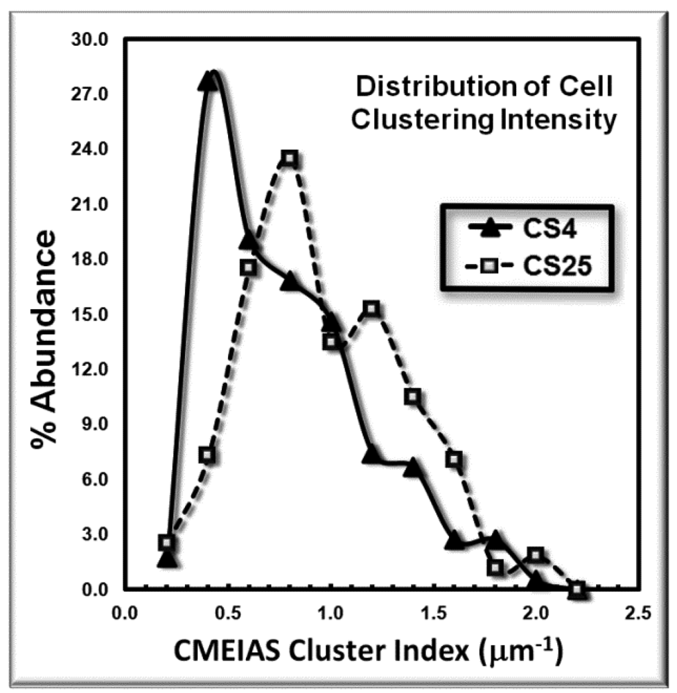 Statistical analyses indicated that the frequency distribution of the 1st and 2nd nearest neighbor distances and cluster indices of cells in these biofilms were significantly skewed and lacked normality (Table 1). The Mann-Whitney non-parametric test indicated that their median values were significantly different, and the cluster index was significantly more intense in the CS25 biofilm (Table 1).