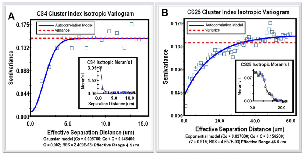 Geostatistical analysis is the most powerful category of spatial pattern analysis that can be used to unravel the spatial uncertainty of interactions between individual microorganisms. This geospatial method examines the continuity or continuous variation of spatial patterns over the entire domain by testing whether a user-defined, continuously distributed regionalized variable (called the “Z-variate”) is spatial autocorrelated, i.e., exhibits spatially-dependent structure [21]. The analysis indicates whether cells at one location (georeferenced by its X,Y Cartesian coordinates) express the Z-variate with sufficient intensity to influence (thereby communicate) the same regionalized response of neighboring cells at another location. Thus, patterns displaying spatial autocorrelation indicate that operations involve a spatial process, i.e., its intensity is significantly influenced by the location of neighboring cells, rather than occurs independent of the location of their neighbors. When found, the autocorrelation result can be mathematically modeled to accurately connect various spatially dependent relationships derived from regionalized variable theory, plus make optimal, statistically rigorous interpolation (kriging) maps of the local intensity of the measured Z-variate parameter within that spatial domain, based on analysis of its weighted average from sampled locations. From the microbial ecology perspective, cellular interactions that are autocorrelated with spatial patterns of microbial distribution within biofilms statistically indicate that communication events (in the broadest sense) significantly influence the in situ colonization behavior (cooperation vs. conflict) of neighboring cells over a defined scale within the spatial domain. At the core of geostatistical analysis is the variogram plot, which defines the extent to which the measured Z-variate exhibits spatial dependence between sample locations. It does so by examining how the values of the Z-variate become different as the spatial separation between the sample points increases. In this example, geostatistics using a simulation analysis of 10,000 subsamples were performed to test for connectivity of each georeferenced cell's cluster index values to their spatial patterns within the 2 biofilm image domains. Semivariance analyses of the clustered indices of the bacteria in the CS4 and CS25 biofilms indicated that this regionalized variable positively autocorrelated with the spatial pattern of distribution (Figure 5(A,B)), and Moran's Index of the same georeferenced data indicated that the intensity of this spatially autocorrelated structure was more than twice as strong for the CS25 biofilm sample (Table 1).