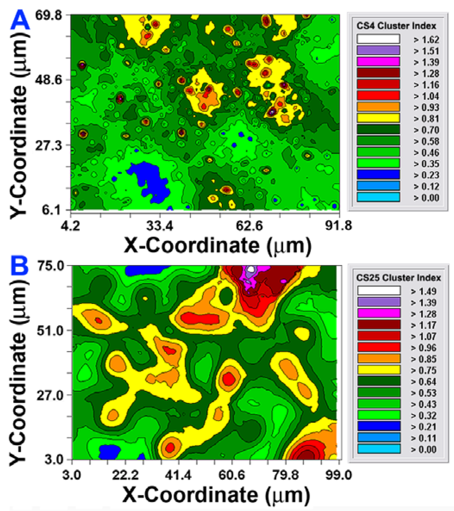 After the autocorrelation model was optimally fit to the data, 1,000 simulations of multigrid refinements of the model were computed to produce the corresponding kriging maps. These high-resolution pseudocolored graphics elegantly map the spatial autocorrelation in the data. This knowledge is used to derive accurate, unbiased estimates of the spatial continuity of Z-variate values within the sampling unit, thereby precisely resolving detailed spatial patterns with known variance for each interpolated point [21]. In this study, the kriging maps depict the centers of local clustered cell intensities that provide a vivid, geostatistically autocorrelated, continuous interpolation of the spatial variability in aggregated colonization behavior over the entire spatial domain, even in areas not sampled (Figure 6(A,B)). Included in the kriging maps are isopleth lines whose curvature connects points of equal intensity (like a weather map). The pseudocolored, intensity-scaled Z-variate and isopleth-defined contours provide clear recognition of the larger patch sizes and greater intensities of this clustered colonization behavior in the CS25 biofilm sample. This experimental test result maps the similarities and differences in the spatial ecology of cells communicating their clustered colonization behavior with neighboring cells.