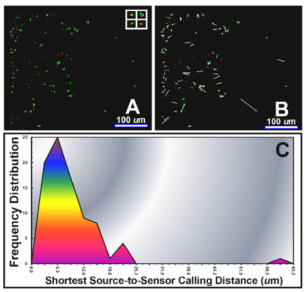 An example of direct in situ evidence of AHL-mediated cell-to-cell communication during bacterial colonization of a tomato root is provided in Figure 7(A). In this case, the green-fluorescent pseudomonad sensor cells are positioned to perceive sufficient concentrations of the AHL signal molecules within gradients made by the red-fluorescent pseudomonads, and respond through gene expression of green fluorescent protein. CMEIAS image analysis at single pixel resolution of the shortest linear distance between each activated (green-fluorescent) sensor cell and its 1st nearest neighboring (red-fluorescent) AHL-source cell (Figure 7(B)) indicated a frequency distribution of calling distances with a mode of 5–6 μm and maximum of 63 μm (Figure 7(C)). These descriptive statistics are similar to our earlier results (mode of 4–5 μm, maximum of 57–78 μm) of a larger analysis of bacterial cell-to-cell communication during colonization on tomato and wheat roots [15]. Control experiments indicated that the gnotobiotic culture systems were maintained free of extraneous microbes (including AHL-producers) and that the AHL-sensor strain did not fluoresce green when inoculated alone on the plants, thereby excluding a false-positive result due to autoinduction or activation by an AHL-mimicking compound of plant origin. Of course, the three-dimensional scale of such AHL gradients in natural rhizospheres would be influenced by the extent of its adsorption to the root and to inanimate soil particles (e.g., clay and humic particulates), quenching by AHL-degrading enzymes made by the plant or other neighboring microbes, and resistance to diffusion by the viscous, discontinuous liquid films covering the root [15].