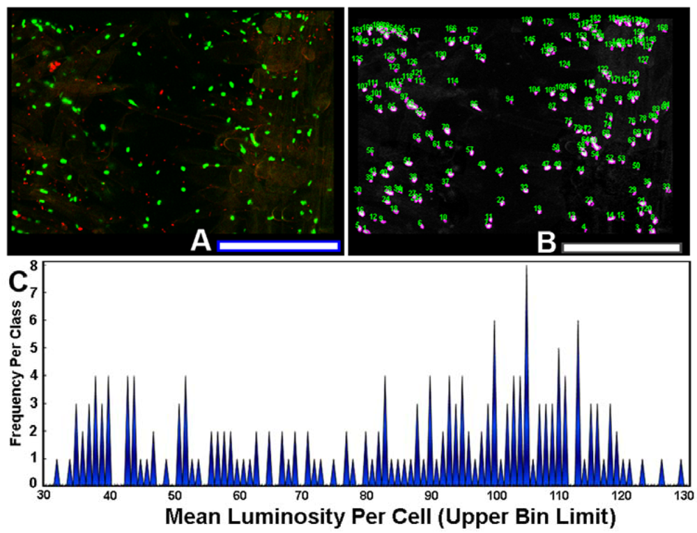 The use of sensor cells that report intracellular fluorescent proteins permits the measurement of expression levels of gene activation by AHL gradients in situ. To quantify the variation in this ecophysiological communication response, each individual AHL-sensor green-fluorescent cell in the image (Figure 8(A)) was color segmented (Figure 8(B)), and its mean luminosity value was extracted by image analysis. The histogram plot of mean luminosity per cell indicates significant cell-to-cell variation in AHL-activated gene expression, with a multi-modal distribution containing at least 15 resolved bins of fluorescent brightness intensity of the intracellular green fluorescent protein (Figure 8(C)). Thus, rhizobacteria communicate with each other while they colonize root surfaces, discussing many scientific topics over a wide range of intensity levels, figuratively from a “soft whisper” to an “intense shouting.” This variation in AHL-activated autoinduction (gene expression) likely reflects, inter alia, their spatial position within the concentration gradients of the signal molecules at the root surface. This experimental test result illustrates the awesome power of computer-assisted microscopy to quantitatively measure bacterial cell communication at single-cell resolution, and also leads one to predict that commonly used population-level measurements of gene expression by sensor strains may grossly underestimate the real-world variation in these same signal transduction responses within biofilms.
