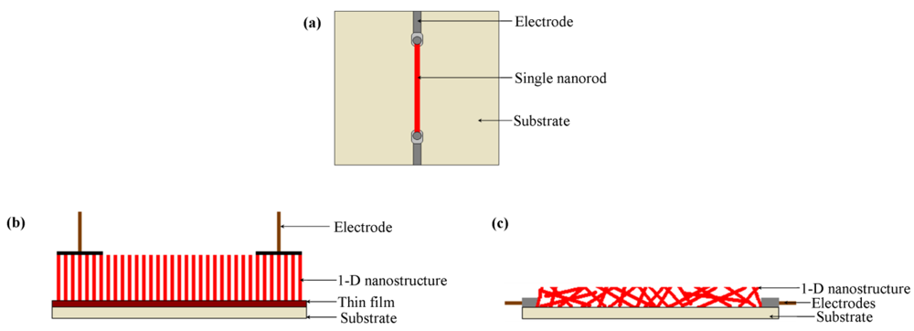These nanostructures can be arranged in different ways for the fabrication of a sensor. Figure 1 illustrates the predominant types of nanostructure arrangements and electrode attachment methods reported in literature. The nanostructure arrangements can be divided into three groups: (a) single nanostructure arrangement, (b) aligned arrangement and (c) random arrangement.