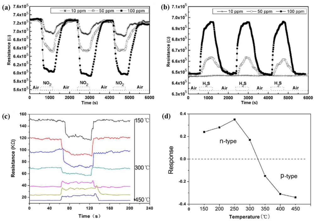 In the literature, sensitivity, response time, recovery time, optimum working temperature and lower limit of detection are reported as the main performance parameters of a sensor. Throughout the literature, sensor sensitivity (S) is defined in several different forms including S = Ra/Rg, S = Rg/Ra, S = ΔR/Rg and S = ΔR/Ra; where Ra is the sensor resistance in ambient air, Rg is the sensor resistance in the target gas, and ΔR = |Ra−Rg| [,,]. In this literature review, the sensitivity values are reported as presented by the author. The formula used to calculate the sensitivity is also indicated. Response time is defined as the time required for a sensor to reach 90% of the total response of the signal such as resistance upon exposure to the target gas. Recovery time is defined as the time required for a sensor to return to 90% of the original baseline signal upon removal the target gas.