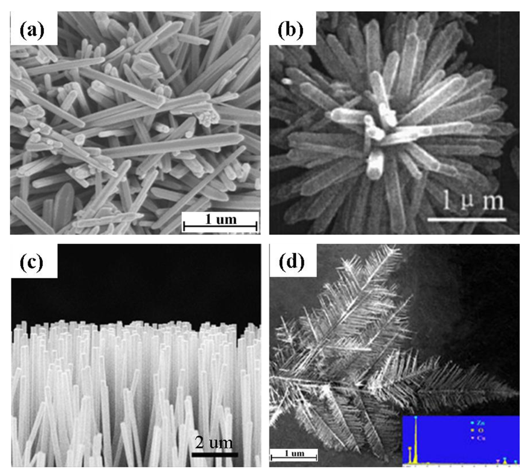 Vapor-phase processing has also been widely used for producing ZnO nanostructures. For example, Lupan et al. [] grew vertically aligned ZnO nanowire (Figure 5(c)) by chemical vapor deposition (CVD) from Zn metal and O2/Ar flux. The Zn metal was evaporated at 670 °C in a quartz tube. The evaporated metal interacted with O2 at 650 °C on a Si substrate. The resulting nnaowires had a diameter of 100 nm with several micron length. Similarly, Wan et al. [] grew ZnO nanowires on Zn pellets by thermal evaporation process by supplying Ar and O2 gas at 900 °C. Additionally, Zhang et al. [] fabricated hierarchical ZnO dendrites (Figure 5(d) by a vapor-phase transport method at 930 °C from ZnO power in the presence of graphite and Cu catalyst. Comparing vapor-phase transport and thermal evaporation, no catalyst is required in the thermal evaporation process.
