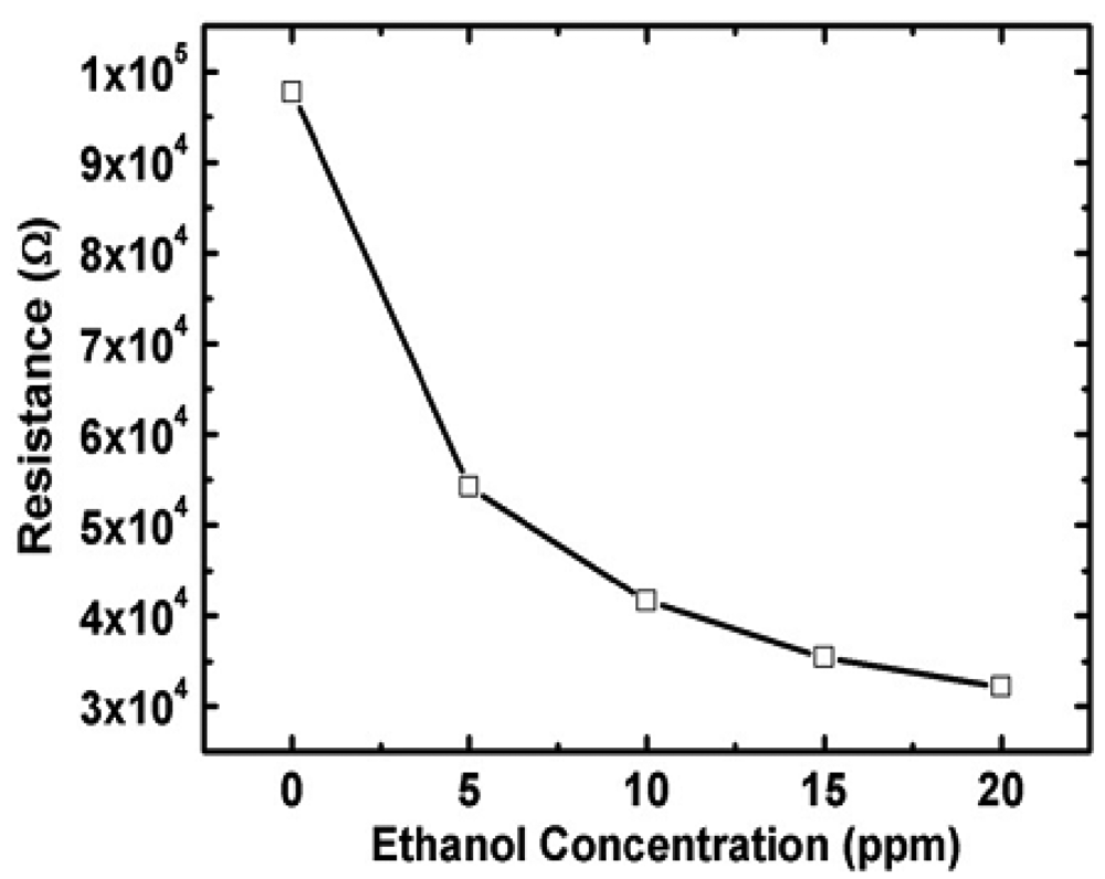 The sensitivity of nanowire arrays on silica fabricated by Francioso et al. [] was studied for ethanol sensing. It was seen that the sensitivity of the sensor was approximately 50 at 550 °C for 2% and 3% ethanol concentrations. Comparing these results to the response of TiO2 thin film, the nanowire array showed higher sensitivity towards ethanol. The response is less than 10 in the case of TiO2 thin film for 2 and 3% ethanol concentrations at 550 °C. Hu et al. [] synthesized four types of TiO2 nanobelts (TiO2 untreated nanobelts, TiO2 surface-coarsened nanobelts, Ag nanoparticles-TiO2 untreated nanobelts and Ag nanoparticles-TiO2 surface-coarsened nanobelts) for the detection of ethanol vapor. It was seen that Ag nanoparticles-TiO2 surface-coarsened nanobelts exhibited the best performance in ethanol vapor detection. The response was 46–153 at 200 °C for 500 ppm ethanol. The optimum working temperature was in the range of 200–250 °C. The response and recovery times were only 1–2 s for ethanol vapor detection.