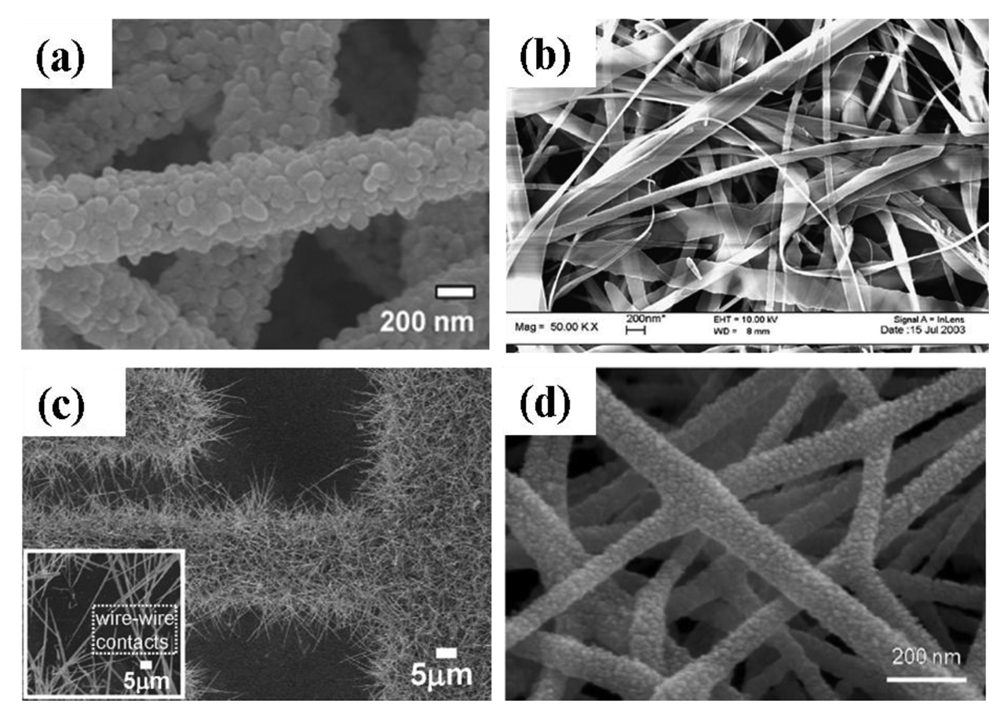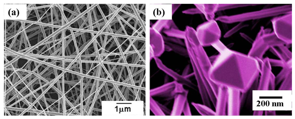 A hybrid process was also reported for the production of mixed SnO2-ZnO composite oxide nanostructures []. For this preparation, Zn(CH3COO)·2H2O was mixed with poly(4-vinylphenol) and stirred for 3 h at 60 °C followed by addition of ethanol. The solution was then loaded into a plastic syringe with a voltage supply of 7 kV. The substrate temperature was maintained at 80 °C. The as-prepared ZnO nanofibers were collected on Pt interdigitated SiO2/Si substrate and calcined at 600 °C. The SnO2 was deposited on the ZnO nanofibers using pulsed laser deposition (PLD) method with KrF excimer laser (λ = 248 nm). A scanning electron microscopy (SEM) micrograph of SnO2-ZnO nanofibers is shown in Figure 7(d).