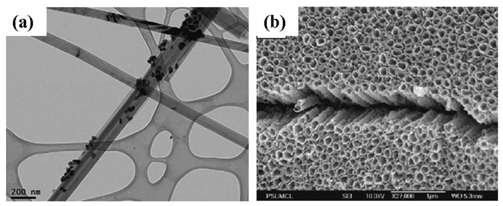 Rout et al. [] synthesized TiO2 nanowires by hydrothermal process by using TiCl3 solution in HCl and saturated NaCl. The mixture was put in a Teflon-lined autoclave and heated at 200 °C for 2 h. The product obtained after cooling the autoclave to room temperature was washed with deionized water and alcohol followed by drying in vacuum. The resulting nanostructures had diameters of 20–80 nm and lengths of 100–800 nm. The crystal structure was found to be rutile. Additionally, Han et al. [] synthesized Pd and Pt nanoparticel-TiO2 nanotubes by hydrothermal processing. A transmission electron microscopy (TEM) image of Pt nanoparticles added TiO2 nanotubes is shown in Figure 8(a). Commercial anatase TiO2 powder and PdCl2 or H2PtCl6 were dispersed in an aqueous solution of NaOH and charged into a Teflon-lined autoclave. The autoclave was heated at 150 °C for 12 h. The precipitates were separated by filtration and washed with dilute HCl and de-ionized water. The synthesized Pd and Pt nanoparticle-TiO2 nanotubes were dried at 120 °C in an oven. The resulting nanotubes were 100 nm in diameter with a lepidocrocite-type phase of titanate. Hu et al. [] prepared TiO2 nanobelts via an alkaline hydrothermal process by using commercial TiO2 powders, NaOH, HCl, and deionized water. The obtained H2Ti3O7 nanobelts were annealed at 600 °C for 1 h to obtain crystalline TiO2 nanobelts. The surface of the TiO2 nanobelts was coarsened by adding H2SO4 into H2Ti3O7 aqueous solution under magnetic stirring followed by heating at 100 °C for 12 h. The powder was washed and annealed at 600 °C for 1 h to obtain surface-coarsened TiO2 nanobelts. For the preparation of Ag nanoparticle-TiO2 nanobelts and surface coarsened Ag nanoparticel-TiO2 nanobelts, the hydrothermal process was combined with a photocatalytic reduction process []. The as-prepared TiO2 nanobelts obtained by hydrothermal route were dispersed into AgNO3 and ethanol solution. The solution was illuminated with a 20 W ultraviolet lamp under magnetic agitation. The obtained phase of TiO2 nanobelt was anatase.