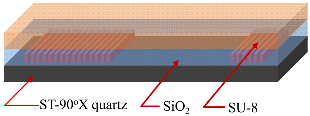 The Love wave delay lines with a SiO2/SU-8 guiding layer were developed on a ST-90°X quartz substrate. First the SH-SAW delay line on ST-90°X quartz with two photolithographically defined Al (250 nm) transducers separated by a path length (transducer center separation) of 2.5 mm was fabricated. The two transducers consist of 120 and 40 finger-pairs interdigitated electrodes, with periodicity of 28 μm for an operation frequency of 175 MHz. A single phase unidirectional transducer (SPUDT) was used to structure the transducers to reduce the low insertion loss [21]. Then, SiO2 thin film was evaporated on the fresh surface of the SH-SAW device by the lift-off technique at room temperature with a sacrificial layer of photoresist 5214. The thickness of SiO2 was set to 0.21 μm according to the theoretical prediction, and monitored by an Alpha-Step IQ profiler. After the SiO2 coating, the SU-8 2050 with various thicknesses produced by the Microchem Company was deposited onto the SiO2 surface by spin coating. The design parameters of the fabricated devices are as listed in Table 3.