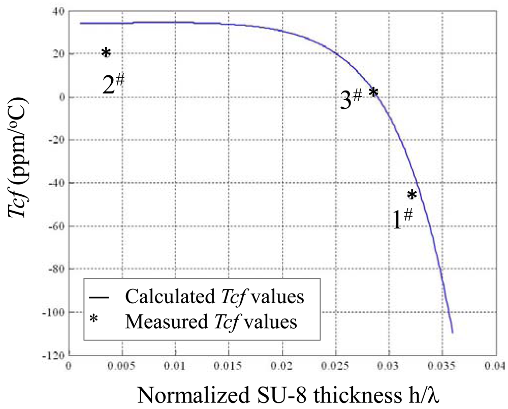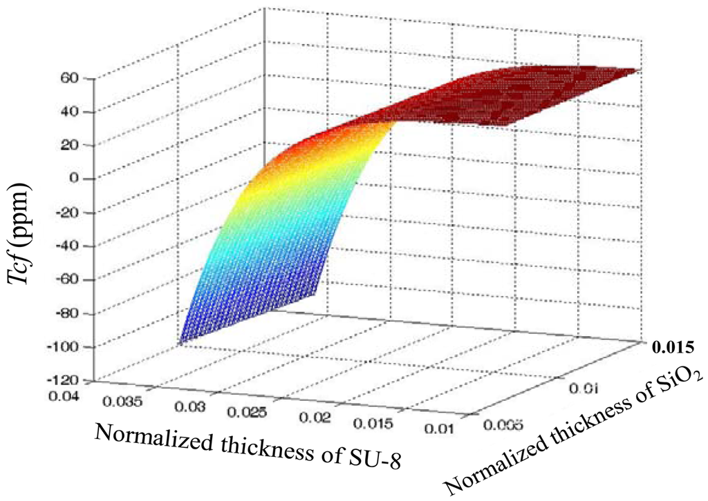 Figure 4 shows calculated Tcf versus normalized thickness of the guide layers in a layered structure of ST-90°X quartz/SiO2/SU-8 using Equation (20). The Tcf value is influenced by SU-8 thickness far more significantly than by that of SiO2. Considering the technical difficulties of thick SiO2 film deposition, a thin SiO2 coating is advised, so, from Figure 3, we can see that when the thickness of SiO2 is 0.2 μm and SU-8 0.826 μm are applied; almost zero Tcf of the device may be achieved.