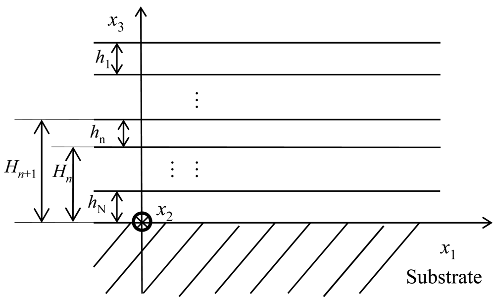 The particle displacement is uncoupled from the electric field within the layers because the layers are assumed to be isotropic materials without piezoelectricity. Suppose several layers were overlaid on the substrate, define the top layer the first one, the one above the substrate the Nth. The layer is finite in the x3-direction and the solution for acoustic waves in the nth layer is of the following form: