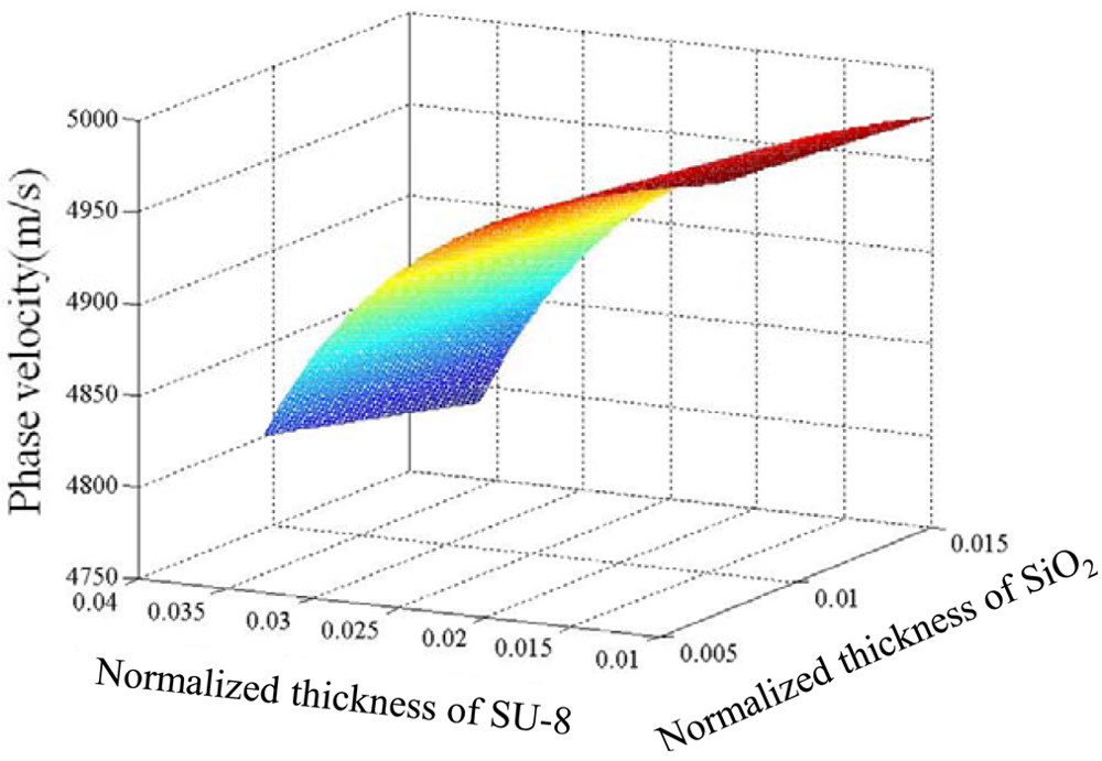 Based on the theoretical formulas mentioned above, and the mechanical parameters of the substrate and guide layers listed in Table 2, the dispersion properties of a Love wave in a layered structure can be analyzed, and the phase velocity of the Love wave depending on the guiding layer thickness at room temperature of 25 °C is as depicted in Figure 3. Only the fundamental Love wave mode exists under the thickness of waveguides we are interested in. From the calculated results, the Love wave velocity decreases with increases of the thickness of the guide layers, and the effect on the Love wave velocity from the SU-8 thickness was more obvious over the SiO2 guide layer.