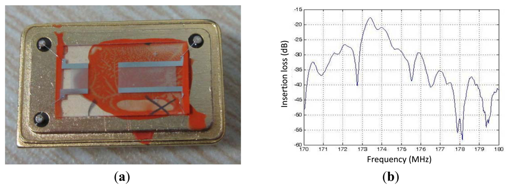 Figure 5(a) shows the fabricated Love wave devices with size of 9 × 3 mm, and also, the frequency response (S21) of the fabricated Love wave device with SU-8 thickness of 0.8 μm, tagged as device #1, which was characterized by a network analyzer (Advantest R3765), as shown in Figure 5(b). Insertion loss of ∼17dB was observed at the frequency of 173.38 MHz.