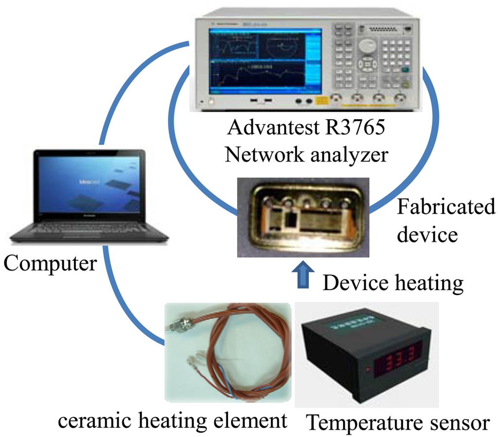 The temperature properties of the fabricated Love wave devices were evaluated experimentally. The measurement setup, which includes the network analyzer, temperature sensor, ceramic heating element and computer, is depicted in Figure 6. The fabricated Love wave delay lines with different SU-8 thicknesses listed in Table 2 were heated by the ceramic heating element, and the network analyzer was used to monitor and recording the frequency shift depending on the applied temperature change. The temperature change of the Love wave device is also read out by the temperature sensor connected to pt100 posted at the bottom of the Love wave device. Both frequency and temperature are acquired in real time by the PC connected to network analyzer and temperature sensor.