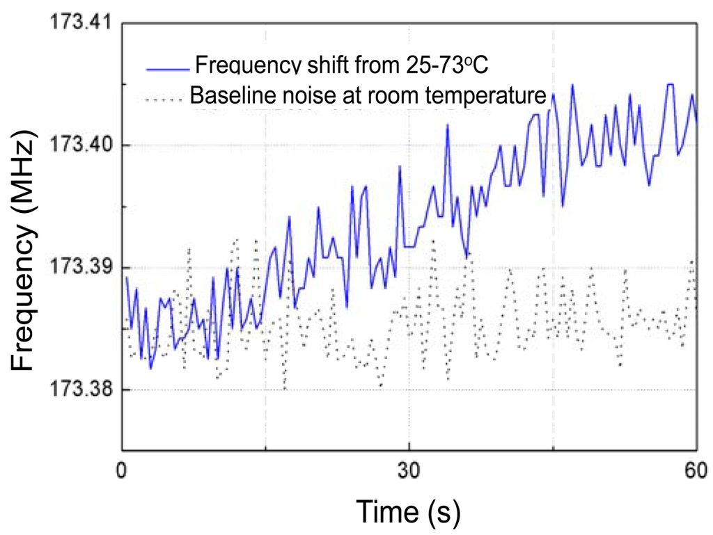 Prior to measurement, the baseline noise of the Love wave device in testing time of 60 s was tested at room temperature (25 °C). It is shown as the dotted line in Figure 7. A frequency shift of ∼10 kHz was observed.