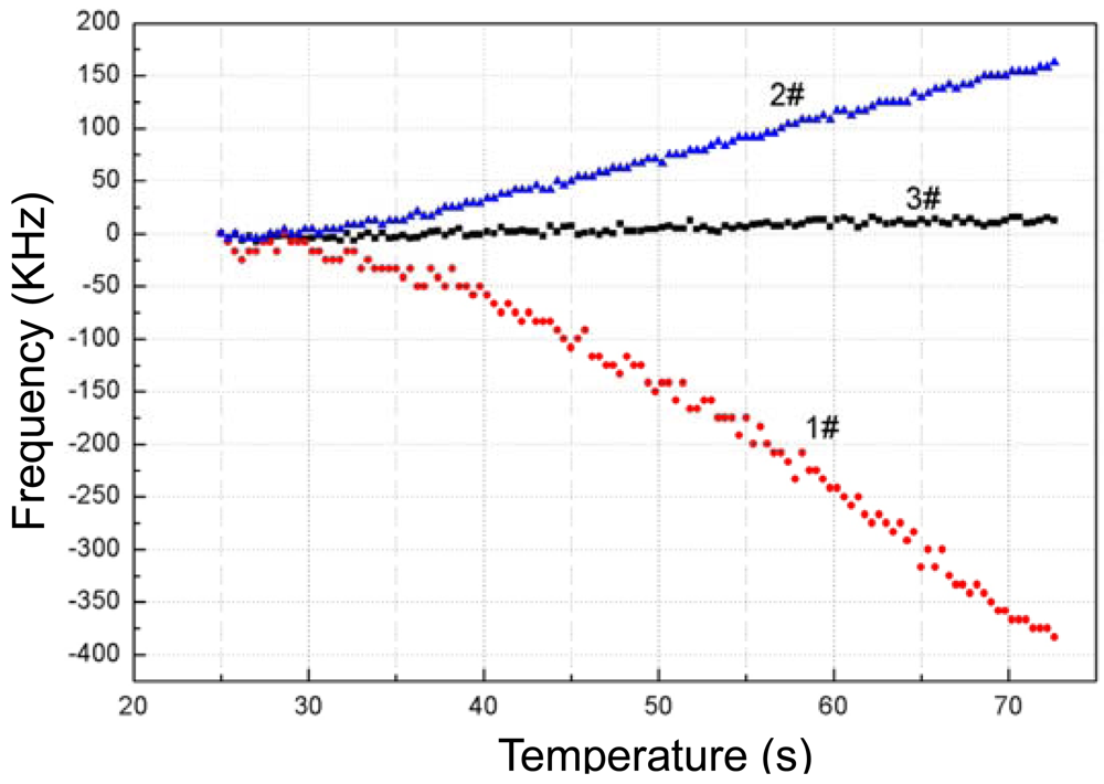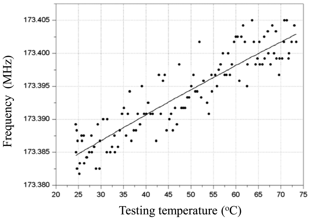 Then, the frequency response depending on temperature variation from 25 °C to 73 °C of the fabricated Love wave delay line (device #3) was measured as shown in Figure 7, and a frequency shift of around 0.018MHz with a temperature increase of 48 °C was observed. The binomial fitting of the measured frequency shift in temperature range of 25 °C∼73 °C was plotted in Figure 8. A very low Tcf of 2.16 ppm/°C (Tcf = 0.018/48/173.38 × 106) was deduced experimentally, and it is far more less than typical Love wave structure (ST-90°X quartz/SiO2) of 27–31 ppm/°C [8]. Also, due to the insertion loss effect due to strain, and the stress effect between the SU-8 and SiO2 layers as temperature increases, another insertion loss of ∼5 dB was induced when the temperature was increased to 73 °C. The temperature properties of another two devices (device 1# and 2#) in the temperature range of 25 °C∼73 °C were also tested as shown in Figure 9, and the corresponding Tcf values for the device 1# and 2# sre depicted in Figure 10.